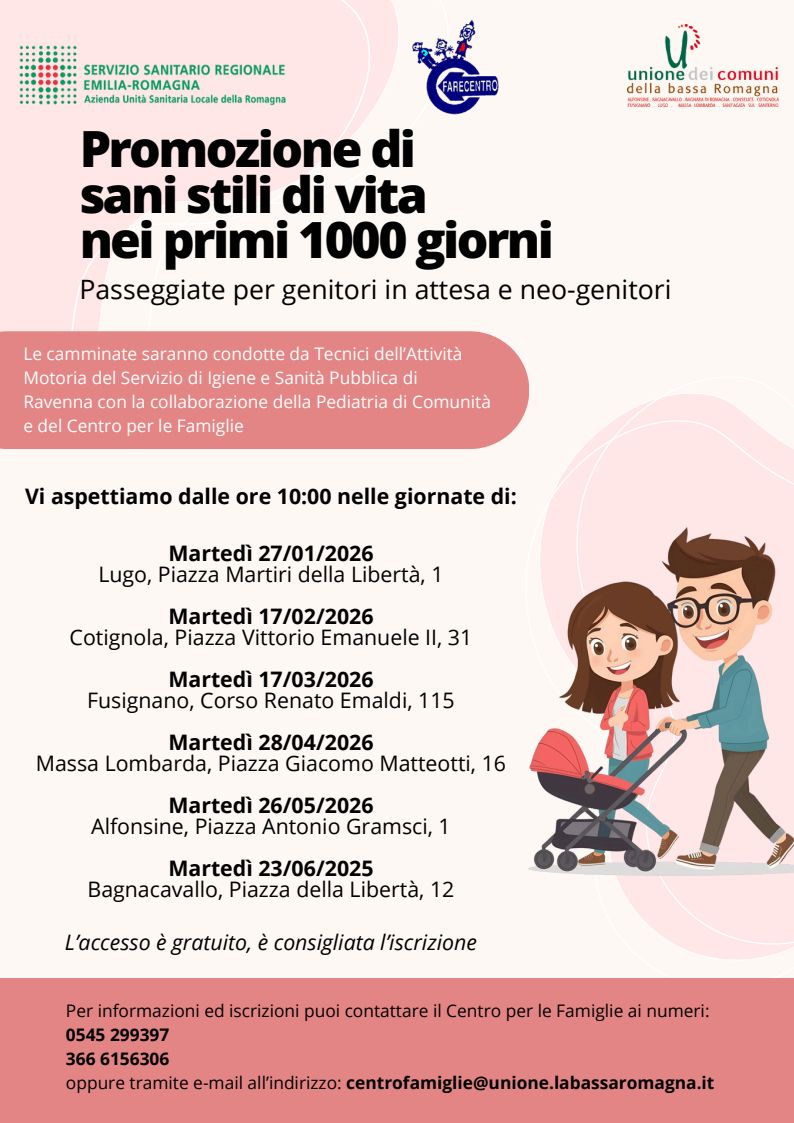 Questa iniziativa rientra infatti nel quadro della promozione degli stili di vita sani nei primi 1000 giorni di vita del bambino, e coinvolge direttamente anche i genitori. Le passeggiate saranno momenti informali di benessere, confronto e socializzazione tra le vie dei Comuni della Bassa Romagna. Un modo per conoscersi, raffrontare aspettative ed esperienze, e camminare insieme nel percorso della genitorialità.