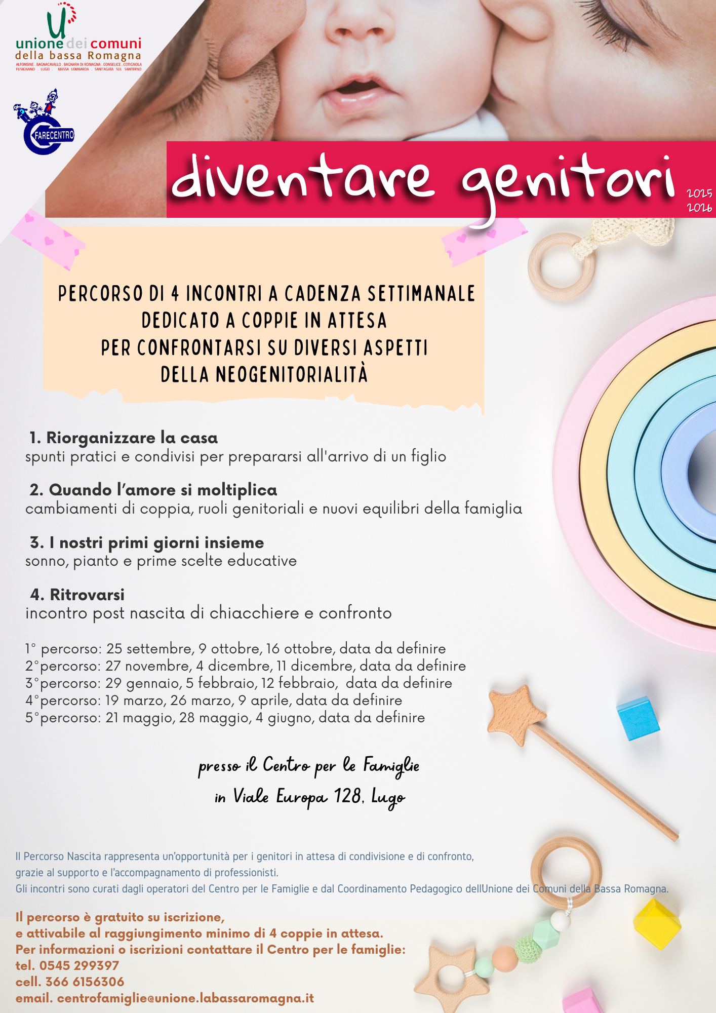 Il Centro per le famiglie dell’Unione dei Comuni della Bassa Romagna organizza periodicamente un percorso di 4 incontri gratuiti a cadenza settimanale dedicato a famiglie in attesa per confrontarsi su diversi aspetti della neogenitorialità. Rappresenta un'opportunità, di condivisione e di confronto, grazie al supporto e l'accompagnamento di professionisti su alcune tematiche relativa la neogenitorialità.